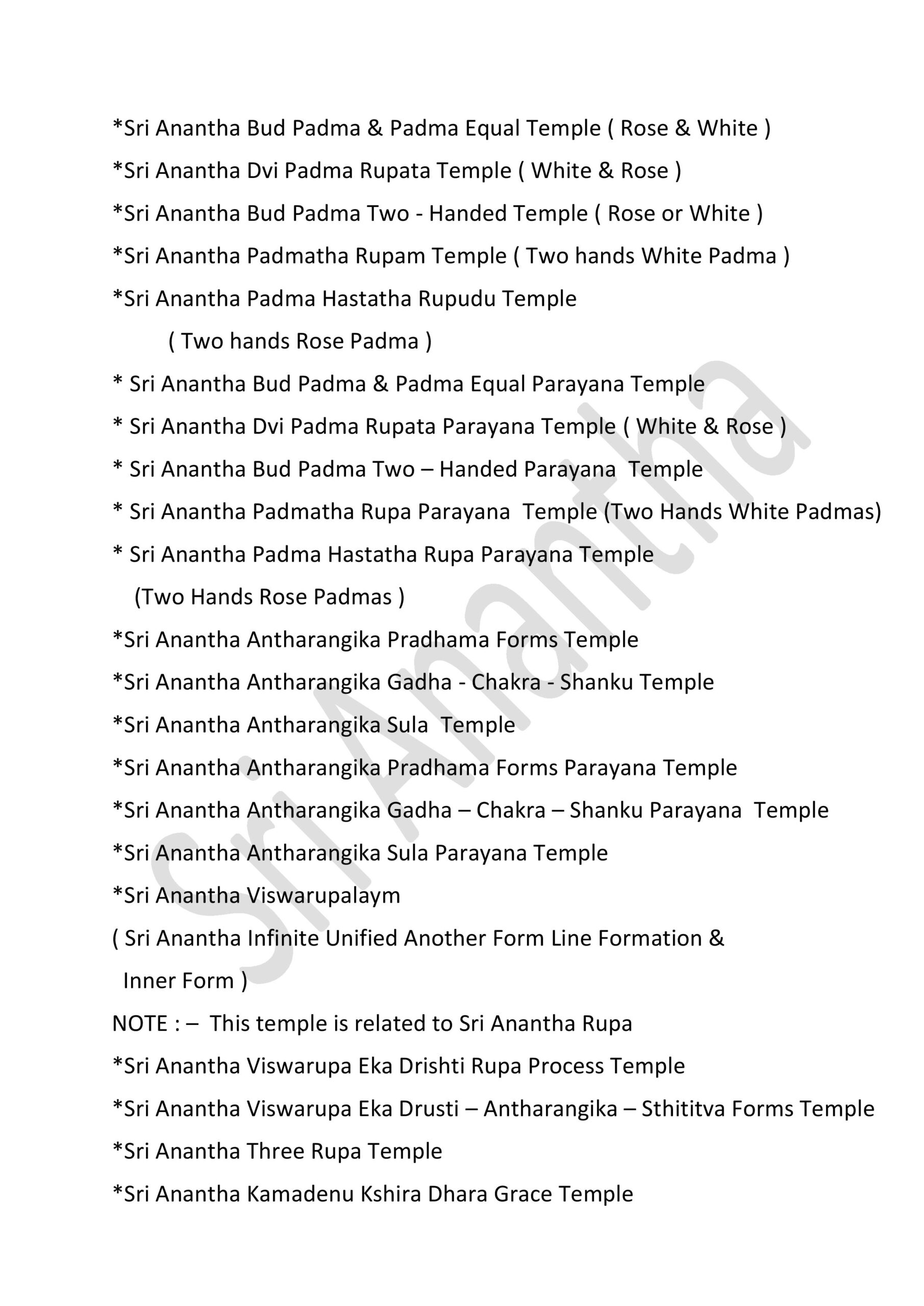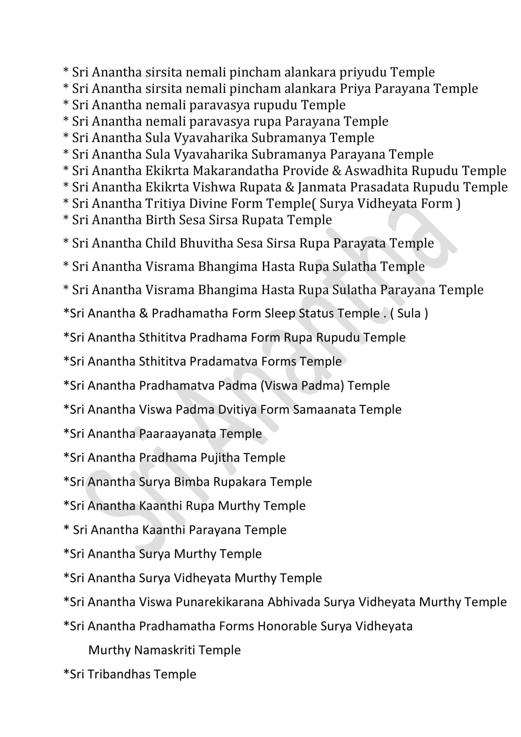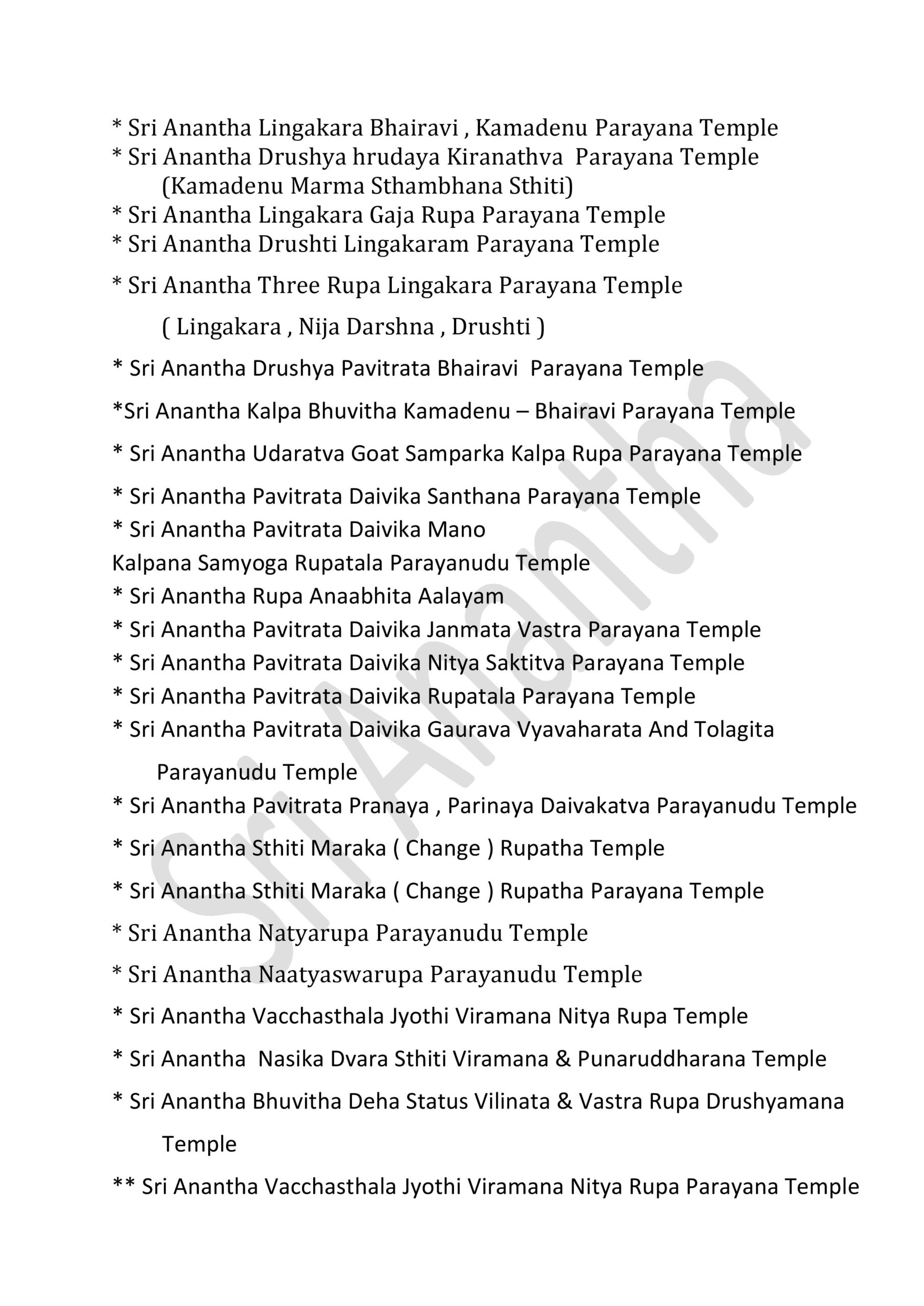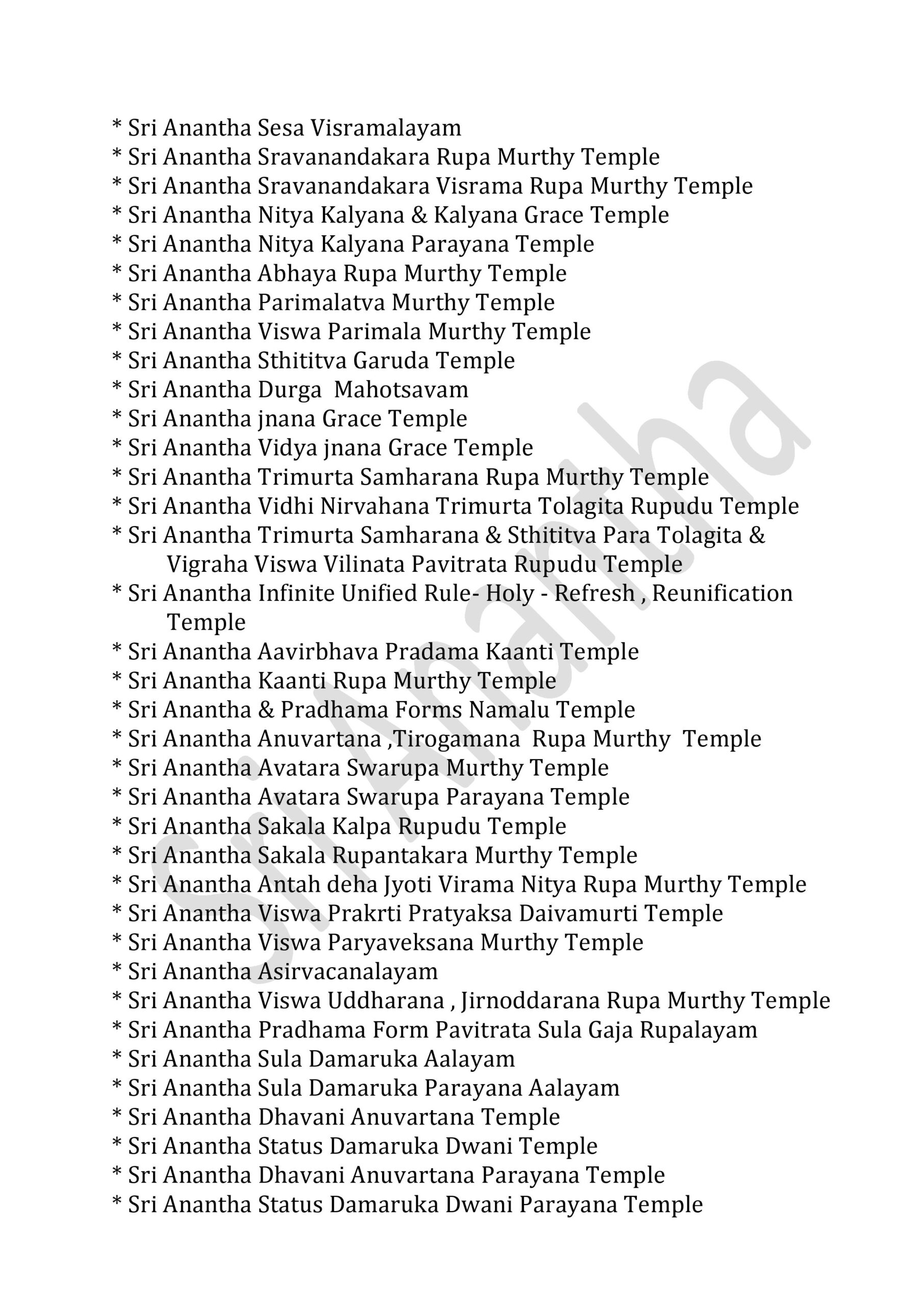 International Sri Anantha Temples – 381 GOVERNMENT OF INFINITE UNIFIED SUPREME DIVINE SRI RAJA REDDY GARI’S INFINITE UNIFIED SRI ANANTHA TEMPLES – 381 * SRI ANANTHA STHITITVA PRADAMA LIKITHA “ SRI “ AKSARA RUPA AALAYAM * Sri Anantha Sthititva Pradama Likitha Sri Aksara Rupa Parayana Temple* Sri Anantha Pradama Likitha Sri Aksara Rupa Temple* Sri Anantha Pradama Likitha Sri Aksara Rupa Parayana Temple* Sri Anantha Aavirbhava Aalayam*Sri Anantha Aavirbhava , Displacement , Displacement Group , Unified Status , Unified Status Rupa Darshana Temple*Sri Anantha Aavirbhava , Displacement , Displacement Group , Unified Status , Unified Status Rupa Darshana Parayana Temple* Sri Anantha Infinite Unified Status & Form Temple* Sri Anantha Pradama Rupa Sthiti Temple* Sri Anantha Sthititva Rupa Parayana Temple* Sri Anantha Rupa Murthy Temple* Sri Anantha Sthiti – Rupa, Drushya , Sravana Murthy Temple* Sri Anantha Sthiti – Rupa, Drushya , Sravana Parayana Temple* Sri Anantha Sthititva Rupa Murthy Temple* Sri Anantha Nitya Rupa Temple* Sri Anantha Nitya Rupa Parayana Temple* Sri Anantha Aadi Rupa Murthy Temple* Sri Anantha Pradama Form Rupa Rupini Birth Status Temple* Sri Anantha Pradama Form Rupa Rupudu Birth Status Temple* Sri Anantha Pradhamatva Forms Birth Status Temple* Sri Anantha Pradamatva Viswa Padma Birth Status Temple* Sri Anantha Pradamatva Padma/ Viswa Padma Dvitiya Form Birth Status Process Temple* Sri Anantha Pradama Samaanata Dvititya Form Temple* Sri Anantha Pradhama Rupa Rupini , Rupa Rupudu Temple* Sri Anantha Pradhama Forms Temple ( all )* Sri Anantha Pradhama Forms Parayana Temple ( all )* Sri Anantha Pradhama Rupa Rupini , Rupa Rupudu Parayana Temple* Sri Anantha Pradhama Forms Parayana Temple ( all )* Sri Anantha Pradhamatva Padma Parayana Temple* Sri Anantha Pradhamatva Padma Elephant Form Temple* Sri Anantha Rupa Rupini Elephant Form Temple*Sri Anantha Rupa Rupudu Elephant Form Temple*Sri Anantha Pradhama Forms Elephant Form Temple ( 4 Forms ).* Sri Anantha Vyavaharika Pradhamatva Forms Weapons Temple* Sri Anantha Vyavaharika Pradhamatva Forms Weapons Parayana Temple* Sri Anantha Pradama Forms Pavitrata Gadha-Chakra – Shanku -Sula Temple* Sri Anantha Vyavaharika Gadha – Chakra- Shanku – Sula Temple* Sri Anantha Tritiya Viswa Parayanudu Temple* Sri Anantha Trtiatva Parayanudu Temple* Sri Anantha Prema ( Matru )Arjitha Pradama Form Temple* Sri Anantha Prema ( Matru )Arjitha Pradama Form Parayana Temple* Sri Anantha Infinite Unified Rule – Holy -Refresh , Reunification Pradhama – Pradhamatva Forms Abhivada Aalayam* Sri Anantha Vidya Jnana Grace Temple* Sri Anantha Rupa Pratyaksa Anandata ( Prasanna) Temple* Sri Anantha Jayanthi Temple* Sri Anantha Father & Mother Temple Father : Highe PersonThose who have attained the cosmic height in the infinite purity of Sri Anantha Mother : Sri Anantha Holy Birth Viswa Virtue Mother Figure* Sri Anantha Rupakatvam* Sri Anantha Rupakatva Parayana Temple * Sri Anantha Padma Gaja Rupalayam* Sri Anantha Sesa Visramalayam* Sri Anantha Sravanandakara Rupa Murthy Temple* Sri Anantha Sravanandakara Visrama Rupa Murthy Temple* Sri Anantha Nitya Kalyana & Kalyana Grace Temple* Sri Anantha Nitya Kalyana Parayana Temple* Sri Anantha Abhaya Rupa Murthy Temple* Sri Anantha Parimalatva Murthy Temple* Sri Anantha Viswa Parimala Murthy Temple* Sri Anantha Sthititva Garuda Temple* Sri Anantha Durga Mahotsavam* Sri Anantha jnana Grace Temple* Sri Anantha Vidya jnana Grace Temple* Sri Anantha Trimurta Samharana Rupa Murthy Temple* Sri Anantha Vidhi Nirvahana Trimurta Tolagita Rupudu Temple* Sri Anantha Trimurta Samharana & Sthititva Para Tolagita & Vigraha Viswa Vilinata Pavitrata Rupudu Temple* Sri Anantha Infinite Unified Rule- Holy – Refresh , Reunification Temple* Sri Anantha Aavirbhava Pradama Kaanti Temple* Sri Anantha Kaanti Rupa Murthy Temple* Sri Anantha & Pradhama Forms Namalu Temple* Sri Anantha Anuvartana ,Tirogamana Rupa Murthy Temple* Sri Anantha Avatara Swarupa Murthy Temple* Sri Anantha Avatara Swarupa Parayana Temple* Sri Anantha Sakala Kalpa Rupudu Temple* Sri Anantha Sakala Rupantakara Murthy Temple* Sri Anantha Antah deha Jyoti Virama Nitya Rupa Murthy Temple* Sri Anantha Viswa Prakrti Pratyaksa Daivamurti Temple* Sri Anantha Viswa Paryaveksana Murthy Temple* Sri Anantha Asirvacanalayam* Sri Anantha Viswa Uddharana , Jirnoddarana Rupa Murthy Temple* Sri Anantha Pradhama Form Pavitrata Sula Gaja Rupalayam* Sri Anantha Sula Damaruka Aalayam* Sri Anantha Sula Damaruka Parayana Aalayam* Sri Anantha Dhavani Anuvartana Temple* Sri Anantha Status Damaruka Dwani Temple* Sri Anantha Dhavani Anuvartana Parayana Temple* Sri Anantha Status Damaruka Dwani Parayana Temple* Sri Anantha Prema Murthy temple* Sri Anantha Prema Swarupa Murthy Temple* Sri Anantha Vishrama Viswa Tamboola Rupa Murthy Temple* Sri Anantha Eka Drishya Rupa Murthy Temple* Sri Anantha Nandita Murthy Temple* Sri Anantha Ubhaya Nandita Murthy Temple* Sri Anantha Vastra Visrama Rupa Murthy Temple ( Sthiti Sankalpam , Gajulamandyam village )* Sri Anantha Pradhama Form Nija Darshna ( Rupini ) Aalayam* Sri Anantha Pradhama Form Nija Darshna ( Rupudu ) Aalayam* Sri Anantha Pradhama Forms Nija Darshna ( Rupini & Rupudu ) Aalayam* Sri Anantha Pradhama Form Nija Darshna Aalayam ( Chakra ) .* Sri Anantha Pradhama Form Nija Darshna Aalayam ( Gadha )* Sri Anantha Pradhama Form Nija Darshna Aalayam ( Shanku )* Sri Anantha Pradhama Form Nija Darshna Aalayam ( Sula )* Sri Anantha Pradhama Forms Nija Darshna Aalayam ( all Forms )* Sri Anantha Naatyarupa Murthy Temple* Sri Anantha Naatyaswarupa Murthy Temple* Sri Anantha Antharangika Sarva Janmitha Rupa Murthy Temple*Sri Anantha Pradhamatva Form (Chakra )Vijnatha Aalayam ( Sri Anantha Balya Rupathanu Vigraha Rupathaloki Tisukunna Pradhamatva Form Vijnatha Aalayam )* Sri Anantha Bhuvita Vidhi Nirvahata Pradama Rupa Rupini Rupa Rupudu Paryaveksana Temple ( Guntakrindhapalli Village )* Sri Anantha Bhuvita Vidhi Nirvahata Pradama Rupa