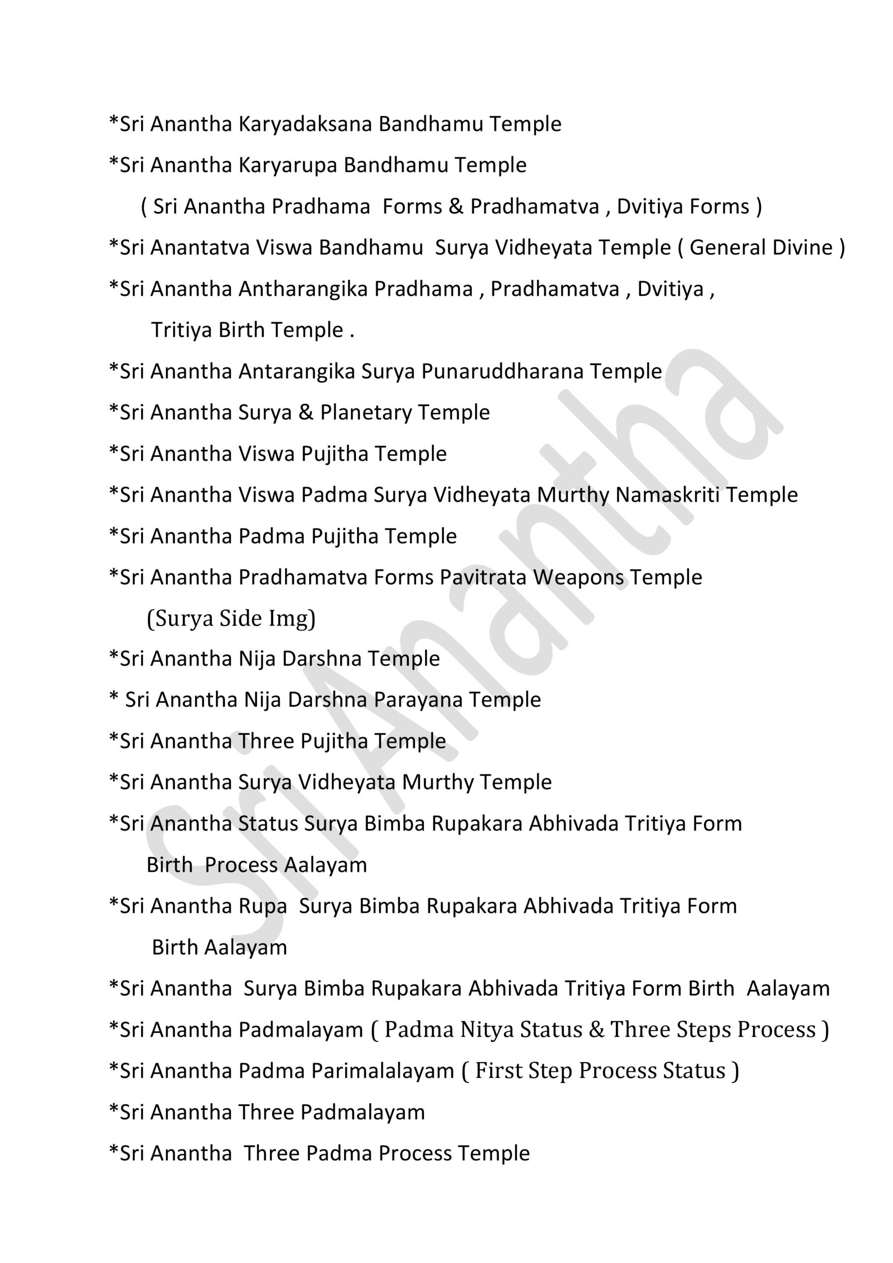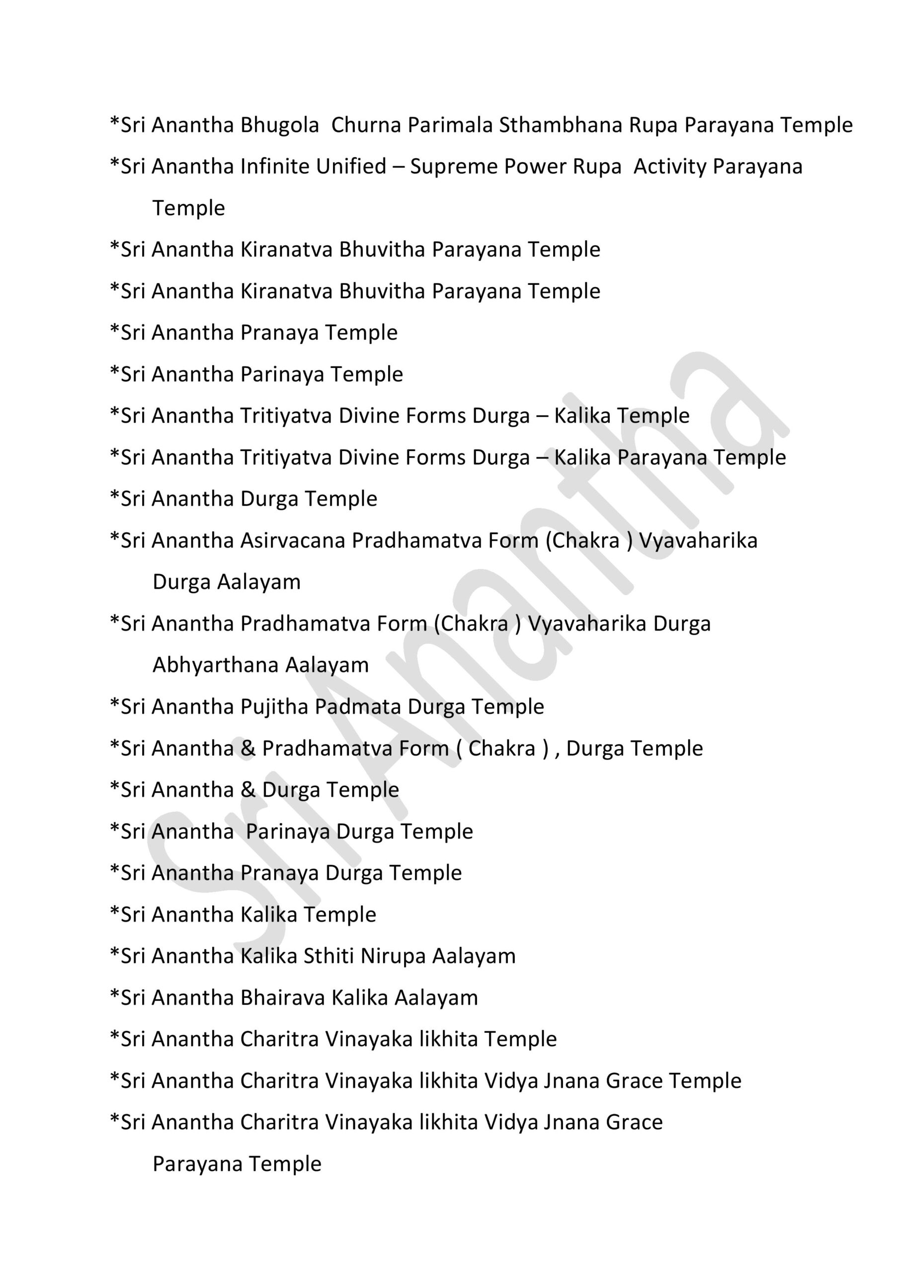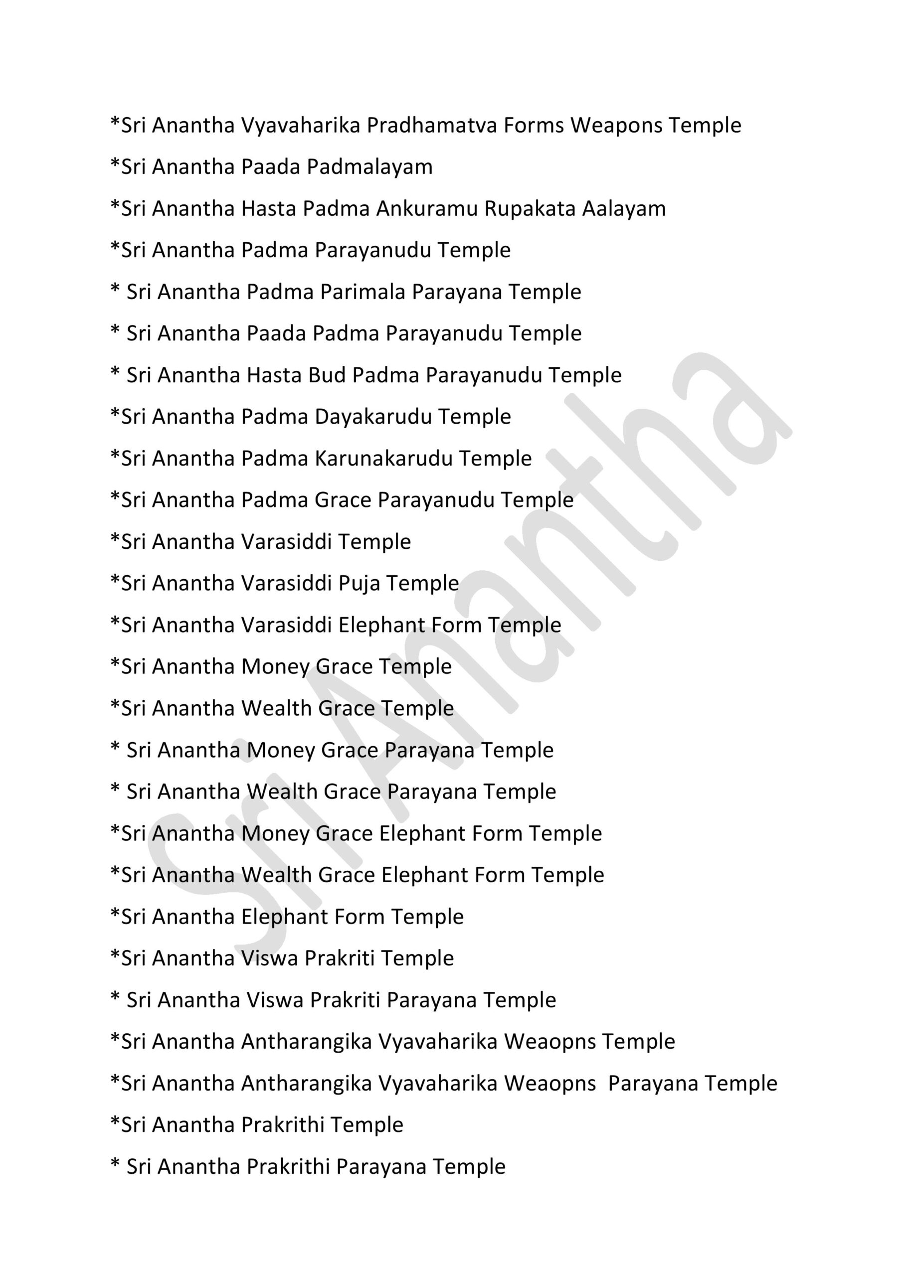 International Sri Anantha Temples – 381 GOVERNMENT OF INFINITE UNIFIED SUPREME DIVINE SRI RAJA REDDY GARI’S INFINITE UNIFIED SRI ANANTHA TEMPLES – 381 * SRI ANANTHA STHITITVA PRADAMA LIKITHA “ SRI “ AKSARA RUPA AALAYAM * Sri Anantha Sthititva Pradama Likitha Sri Aksara Rupa Parayana Temple* Sri Anantha Pradama Likitha Sri Aksara Rupa Temple* Sri Anantha Pradama Likitha Sri Aksara Rupa Parayana Temple* Sri Anantha Aavirbhava Aalayam*Sri Anantha Aavirbhava , Displacement , Displacement Group , Unified Status , Unified Status Rupa Darshana Temple*Sri Anantha Aavirbhava , Displacement , Displacement Group , Unified Status , Unified Status Rupa Darshana Parayana Temple* Sri Anantha Infinite Unified Status & Form Temple* Sri Anantha Pradama Rupa Sthiti Temple* Sri Anantha Sthititva Rupa Parayana Temple* Sri Anantha Rupa Murthy Temple* Sri Anantha Sthiti – Rupa, Drushya , Sravana Murthy Temple* Sri Anantha Sthiti – Rupa, Drushya , Sravana Parayana Temple* Sri Anantha Sthititva Rupa Murthy Temple* Sri Anantha Nitya Rupa Temple* Sri Anantha Nitya Rupa Parayana Temple* Sri Anantha Aadi Rupa Murthy Temple* Sri Anantha Pradama Form Rupa Rupini Birth Status Temple* Sri Anantha Pradama Form Rupa Rupudu Birth Status Temple* Sri Anantha Pradhamatva Forms Birth Status Temple* Sri Anantha Pradamatva Viswa Padma Birth Status Temple* Sri Anantha Pradamatva Padma/ Viswa Padma Dvitiya Form Birth Status Process Temple* Sri Anantha Pradama Samaanata Dvititya Form Temple* Sri Anantha Pradhama Rupa Rupini , Rupa Rupudu Temple* Sri Anantha Pradhama Forms Temple ( all )* Sri Anantha Pradhama Forms Parayana Temple ( all )* Sri Anantha Pradhama Rupa Rupini , Rupa Rupudu Parayana Temple* Sri Anantha Pradhama Forms Parayana Temple ( all )* Sri Anantha Pradhamatva Padma Parayana Temple* Sri Anantha Pradhamatva Padma Elephant Form Temple* Sri Anantha Rupa Rupini Elephant Form Temple*Sri Anantha Rupa Rupudu Elephant Form Temple*Sri Anantha Pradhama Forms Elephant Form Temple ( 4 Forms ).* Sri Anantha Vyavaharika Pradhamatva Forms Weapons Temple* Sri Anantha Vyavaharika Pradhamatva Forms Weapons Parayana Temple* Sri Anantha Pradama Forms Pavitrata Gadha-Chakra – Shanku -Sula Temple* Sri Anantha Vyavaharika Gadha – Chakra- Shanku – Sula Temple* Sri Anantha Tritiya Viswa Parayanudu Temple* Sri Anantha Trtiatva Parayanudu Temple* Sri Anantha Prema ( Matru )Arjitha Pradama Form Temple* Sri Anantha Prema ( Matru )Arjitha Pradama Form Parayana Temple* Sri Anantha Infinite Unified Rule – Holy -Refresh , Reunification Pradhama – Pradhamatva Forms Abhivada Aalayam* Sri Anantha Vidya Jnana Grace Temple* Sri Anantha Rupa Pratyaksa Anandata ( Prasanna) Temple* Sri Anantha Jayanthi Temple* Sri Anantha Father & Mother Temple Father : Highe PersonThose who have attained the cosmic height in the infinite purity of Sri Anantha Mother : Sri Anantha Holy Birth Viswa Virtue Mother Figure* Sri Anantha Rupakatvam* Sri Anantha Rupakatva Parayana Temple * Sri Anantha Padma Gaja Rupalayam* Sri Anantha Sesa Visramalayam* Sri Anantha Sravanandakara Rupa Murthy Temple* Sri Anantha Sravanandakara Visrama Rupa Murthy Temple* Sri Anantha Nitya Kalyana & Kalyana Grace Temple* Sri Anantha Nitya Kalyana Parayana Temple* Sri Anantha Abhaya Rupa Murthy Temple* Sri Anantha Parimalatva Murthy Temple* Sri Anantha Viswa Parimala Murthy Temple* Sri Anantha Sthititva Garuda Temple* Sri Anantha Durga Mahotsavam* Sri Anantha jnana Grace Temple* Sri Anantha Vidya jnana Grace Temple* Sri Anantha Trimurta Samharana Rupa Murthy Temple* Sri Anantha Vidhi Nirvahana Trimurta Tolagita Rupudu Temple* Sri Anantha Trimurta Samharana & Sthititva Para Tolagita & Vigraha Viswa Vilinata Pavitrata Rupudu Temple* Sri Anantha Infinite Unified Rule- Holy – Refresh , Reunification Temple* Sri Anantha Aavirbhava Pradama Kaanti Temple* Sri Anantha Kaanti Rupa Murthy Temple* Sri Anantha & Pradhama Forms Namalu Temple* Sri Anantha Anuvartana ,Tirogamana Rupa Murthy Temple* Sri Anantha Avatara Swarupa Murthy Temple* Sri Anantha Avatara Swarupa Parayana Temple* Sri Anantha Sakala Kalpa Rupudu Temple* Sri Anantha Sakala Rupantakara Murthy Temple* Sri Anantha Antah deha Jyoti Virama Nitya Rupa Murthy Temple* Sri Anantha Viswa Prakrti Pratyaksa Daivamurti Temple* Sri Anantha Viswa Paryaveksana Murthy Temple* Sri Anantha Asirvacanalayam* Sri Anantha Viswa Uddharana , Jirnoddarana Rupa Murthy Temple* Sri Anantha Pradhama Form Pavitrata Sula Gaja Rupalayam* Sri Anantha Sula Damaruka Aalayam* Sri Anantha Sula Damaruka Parayana Aalayam* Sri Anantha Dhavani Anuvartana Temple* Sri Anantha Status Damaruka Dwani Temple* Sri Anantha Dhavani Anuvartana Parayana Temple* Sri Anantha Status Damaruka Dwani Parayana Temple* Sri Anantha Prema Murthy temple* Sri Anantha Prema Swarupa Murthy Temple* Sri Anantha Vishrama Viswa Tamboola Rupa Murthy Temple* Sri Anantha Eka Drishya Rupa Murthy Temple* Sri Anantha Nandita Murthy Temple* Sri Anantha Ubhaya Nandita Murthy Temple* Sri Anantha Vastra Visrama Rupa Murthy Temple ( Sthiti Sankalpam , Gajulamandyam village )* Sri Anantha Pradhama Form Nija Darshna ( Rupini ) Aalayam* Sri Anantha Pradhama Form Nija Darshna ( Rupudu ) Aalayam* Sri Anantha Pradhama Forms Nija Darshna ( Rupini & Rupudu ) Aalayam* Sri Anantha Pradhama Form Nija Darshna Aalayam ( Chakra ) .* Sri Anantha Pradhama Form Nija Darshna Aalayam ( Gadha )* Sri Anantha Pradhama Form Nija Darshna Aalayam ( Shanku )* Sri Anantha Pradhama Form Nija Darshna Aalayam ( Sula )* Sri Anantha Pradhama Forms Nija Darshna Aalayam ( all Forms )* Sri Anantha Naatyarupa Murthy Temple* Sri Anantha Naatyaswarupa Murthy Temple* Sri Anantha Antharangika Sarva Janmitha Rupa Murthy Temple*Sri Anantha Pradhamatva Form (Chakra )Vijnatha Aalayam ( Sri Anantha Balya Rupathanu Vigraha Rupathaloki Tisukunna Pradhamatva Form Vijnatha Aalayam )* Sri Anantha Bhuvita Vidhi Nirvahata Pradama Rupa Rupini Rupa Rupudu Paryaveksana Temple ( Guntakrindhapalli Village )* Sri Anantha Bhuvita Vidhi Nirvahata Pradama Rupa