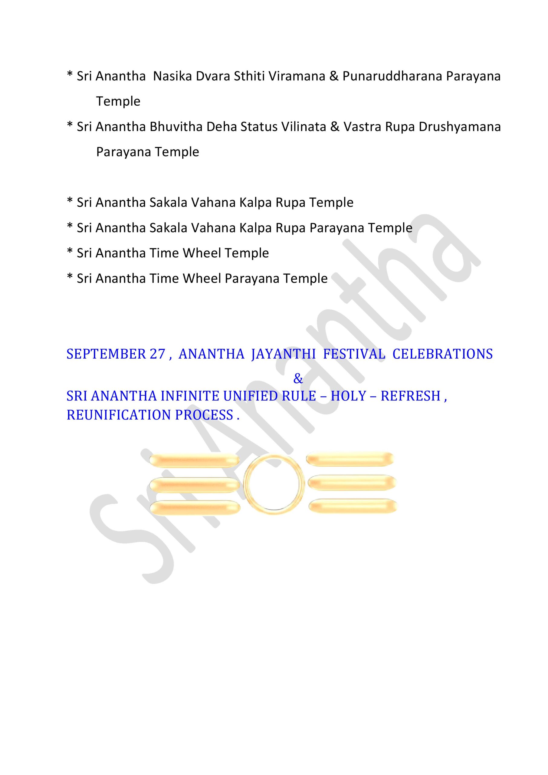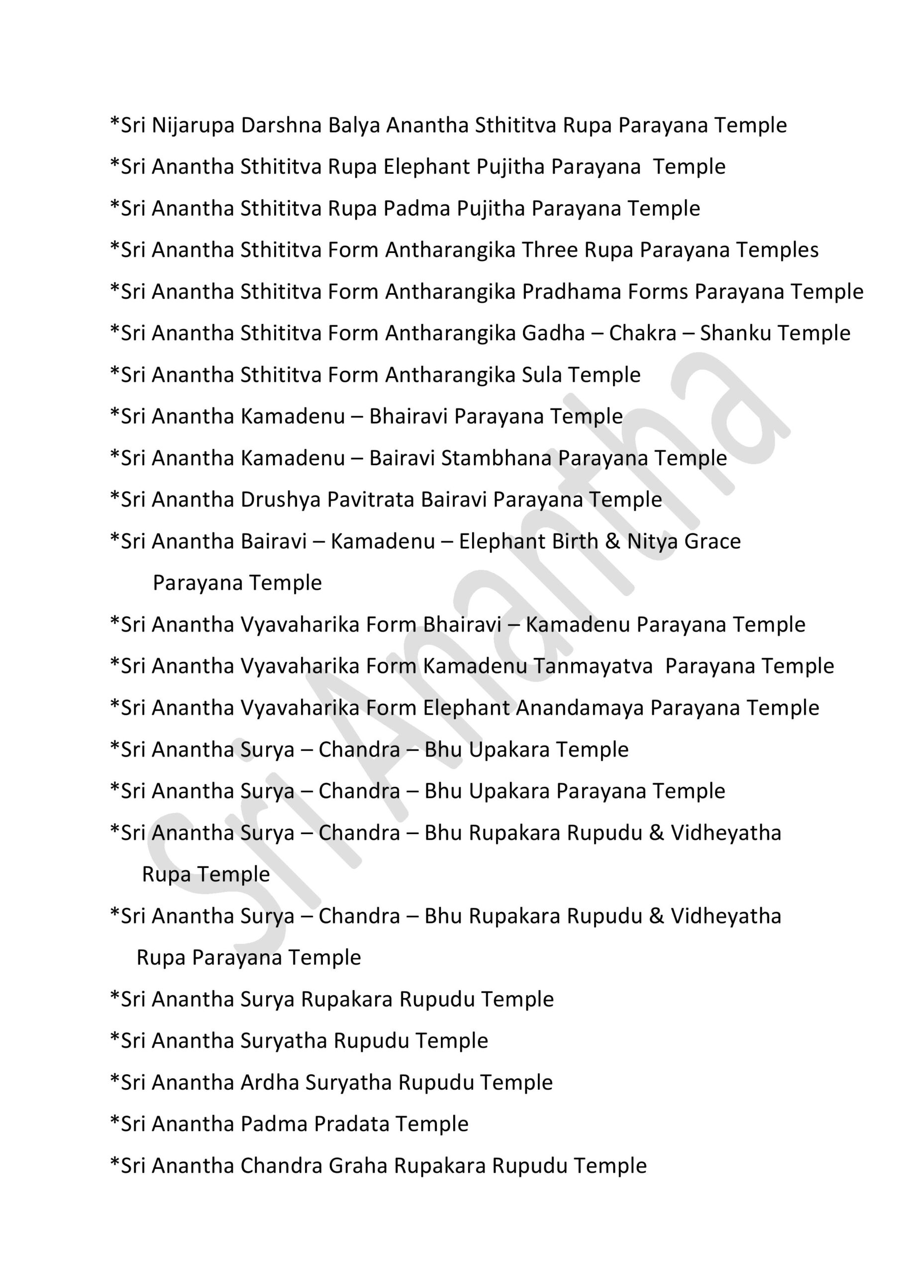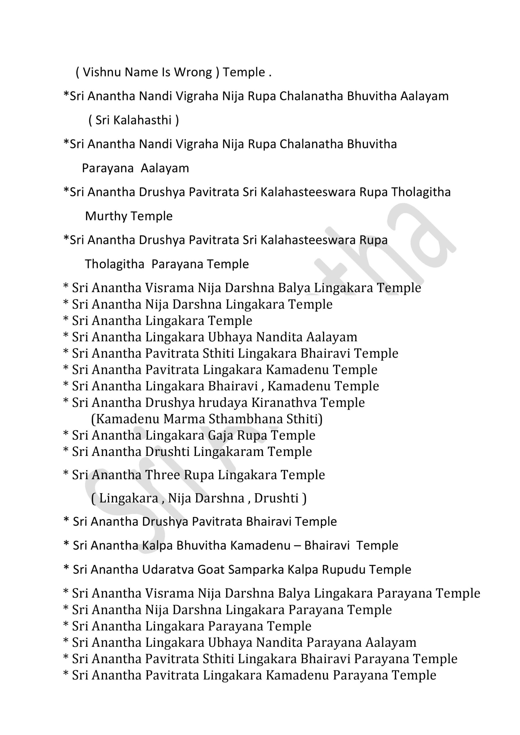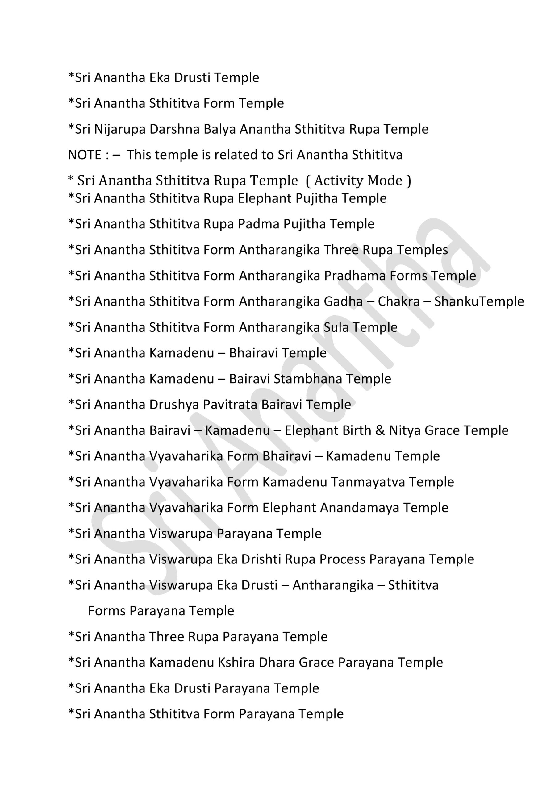 International Sri Anantha Temples – 381 GOVERNMENT OF INFINITE UNIFIED SUPREME DIVINE SRI RAJA REDDY GARI’S INFINITE UNIFIED SRI ANANTHA TEMPLES – 381 * SRI ANANTHA STHITITVA PRADAMA LIKITHA “ SRI “ AKSARA RUPA AALAYAM * Sri Anantha Sthititva Pradama Likitha Sri Aksara Rupa Parayana Temple* Sri Anantha Pradama Likitha Sri Aksara Rupa Temple* Sri Anantha Pradama Likitha Sri Aksara Rupa Parayana Temple* Sri Anantha Aavirbhava Aalayam*Sri Anantha Aavirbhava , Displacement , Displacement Group , Unified Status , Unified Status Rupa Darshana Temple*Sri Anantha Aavirbhava , Displacement , Displacement Group , Unified Status , Unified Status Rupa Darshana Parayana Temple* Sri Anantha Infinite Unified Status & Form Temple* Sri Anantha Pradama Rupa Sthiti Temple* Sri Anantha Sthititva Rupa Parayana Temple* Sri Anantha Rupa Murthy Temple* Sri Anantha Sthiti – Rupa, Drushya , Sravana Murthy Temple* Sri Anantha Sthiti – Rupa, Drushya , Sravana Parayana Temple* Sri Anantha Sthititva Rupa Murthy Temple* Sri Anantha Nitya Rupa Temple* Sri Anantha Nitya Rupa Parayana Temple* Sri Anantha Aadi Rupa Murthy Temple* Sri Anantha Pradama Form Rupa Rupini Birth Status Temple* Sri Anantha Pradama Form Rupa Rupudu Birth Status Temple* Sri Anantha Pradhamatva Forms Birth Status Temple* Sri Anantha Pradamatva Viswa Padma Birth Status Temple* Sri Anantha Pradamatva Padma/ Viswa Padma Dvitiya Form Birth Status Process Temple* Sri Anantha Pradama Samaanata Dvititya Form Temple* Sri Anantha Pradhama Rupa Rupini , Rupa Rupudu Temple* Sri Anantha Pradhama Forms Temple ( all )* Sri Anantha Pradhama Forms Parayana Temple ( all )* Sri Anantha Pradhama Rupa Rupini , Rupa Rupudu Parayana Temple* Sri Anantha Pradhama Forms Parayana Temple ( all )* Sri Anantha Pradhamatva Padma Parayana Temple* Sri Anantha Pradhamatva Padma Elephant Form Temple* Sri Anantha Rupa Rupini Elephant Form Temple*Sri Anantha Rupa Rupudu Elephant Form Temple*Sri Anantha Pradhama Forms Elephant Form Temple ( 4 Forms ).* Sri Anantha Vyavaharika Pradhamatva Forms Weapons Temple* Sri Anantha Vyavaharika Pradhamatva Forms Weapons Parayana Temple* Sri Anantha Pradama Forms Pavitrata Gadha-Chakra – Shanku -Sula Temple* Sri Anantha Vyavaharika Gadha – Chakra- Shanku – Sula Temple* Sri Anantha Tritiya Viswa Parayanudu Temple* Sri Anantha Trtiatva Parayanudu Temple* Sri Anantha Prema ( Matru )Arjitha Pradama Form Temple* Sri Anantha Prema ( Matru )Arjitha Pradama Form Parayana Temple* Sri Anantha Infinite Unified Rule – Holy -Refresh , Reunification Pradhama – Pradhamatva Forms Abhivada Aalayam* Sri Anantha Vidya Jnana Grace Temple* Sri Anantha Rupa Pratyaksa Anandata ( Prasanna) Temple* Sri Anantha Jayanthi Temple* Sri Anantha Father & Mother Temple Father : Highe PersonThose who have attained the cosmic height in the infinite purity of Sri Anantha Mother : Sri Anantha Holy Birth Viswa Virtue Mother Figure* Sri Anantha Rupakatvam* Sri Anantha Rupakatva Parayana Temple * Sri Anantha Padma Gaja Rupalayam* Sri Anantha Sesa Visramalayam* Sri Anantha Sravanandakara Rupa Murthy Temple* Sri Anantha Sravanandakara Visrama Rupa Murthy Temple* Sri Anantha Nitya Kalyana & Kalyana Grace Temple* Sri Anantha Nitya Kalyana Parayana Temple* Sri Anantha Abhaya Rupa Murthy Temple* Sri Anantha Parimalatva Murthy Temple* Sri Anantha Viswa Parimala Murthy Temple* Sri Anantha Sthititva Garuda Temple* Sri Anantha Durga Mahotsavam* Sri Anantha jnana Grace Temple* Sri Anantha Vidya jnana Grace Temple* Sri Anantha Trimurta Samharana Rupa Murthy Temple* Sri Anantha Vidhi Nirvahana Trimurta Tolagita Rupudu Temple* Sri Anantha Trimurta Samharana & Sthititva Para Tolagita & Vigraha Viswa Vilinata Pavitrata Rupudu Temple* Sri Anantha Infinite Unified Rule- Holy – Refresh , Reunification Temple* Sri Anantha Aavirbhava Pradama Kaanti Temple* Sri Anantha Kaanti Rupa Murthy Temple* Sri Anantha & Pradhama Forms Namalu Temple* Sri Anantha Anuvartana ,Tirogamana Rupa Murthy Temple* Sri Anantha Avatara Swarupa Murthy Temple* Sri Anantha Avatara Swarupa Parayana Temple* Sri Anantha Sakala Kalpa Rupudu Temple* Sri Anantha Sakala Rupantakara Murthy Temple* Sri Anantha Antah deha Jyoti Virama Nitya Rupa Murthy Temple* Sri Anantha Viswa Prakrti Pratyaksa Daivamurti Temple* Sri Anantha Viswa Paryaveksana Murthy Temple* Sri Anantha Asirvacanalayam* Sri Anantha Viswa Uddharana , Jirnoddarana Rupa Murthy Temple* Sri Anantha Pradhama Form Pavitrata Sula Gaja Rupalayam* Sri Anantha Sula Damaruka Aalayam* Sri Anantha Sula Damaruka Parayana Aalayam* Sri Anantha Dhavani Anuvartana Temple* Sri Anantha Status Damaruka Dwani Temple* Sri Anantha Dhavani Anuvartana Parayana Temple* Sri Anantha Status Damaruka Dwani Parayana Temple* Sri Anantha Prema Murthy temple* Sri Anantha Prema Swarupa Murthy Temple* Sri Anantha Vishrama Viswa Tamboola Rupa Murthy Temple* Sri Anantha Eka Drishya Rupa Murthy Temple* Sri Anantha Nandita Murthy Temple* Sri Anantha Ubhaya Nandita Murthy Temple* Sri Anantha Vastra Visrama Rupa Murthy Temple ( Sthiti Sankalpam , Gajulamandyam village )* Sri Anantha Pradhama Form Nija Darshna ( Rupini ) Aalayam* Sri Anantha Pradhama Form Nija Darshna ( Rupudu ) Aalayam* Sri Anantha Pradhama Forms Nija Darshna ( Rupini & Rupudu ) Aalayam* Sri Anantha Pradhama Form Nija Darshna Aalayam ( Chakra ) .* Sri Anantha Pradhama Form Nija Darshna Aalayam ( Gadha )* Sri Anantha Pradhama Form Nija Darshna Aalayam ( Shanku )* Sri Anantha Pradhama Form Nija Darshna Aalayam ( Sula )* Sri Anantha Pradhama Forms Nija Darshna Aalayam ( all Forms )* Sri Anantha Naatyarupa Murthy Temple* Sri Anantha Naatyaswarupa Murthy Temple* Sri Anantha Antharangika Sarva Janmitha Rupa Murthy Temple*Sri Anantha Pradhamatva Form (Chakra )Vijnatha Aalayam ( Sri Anantha Balya Rupathanu Vigraha Rupathaloki Tisukunna Pradhamatva Form Vijnatha Aalayam )* Sri Anantha Bhuvita Vidhi Nirvahata Pradama Rupa Rupini Rupa Rupudu Paryaveksana Temple ( Guntakrindhapalli Village )* Sri Anantha Bhuvita Vidhi Nirvahata Pradama Rupa